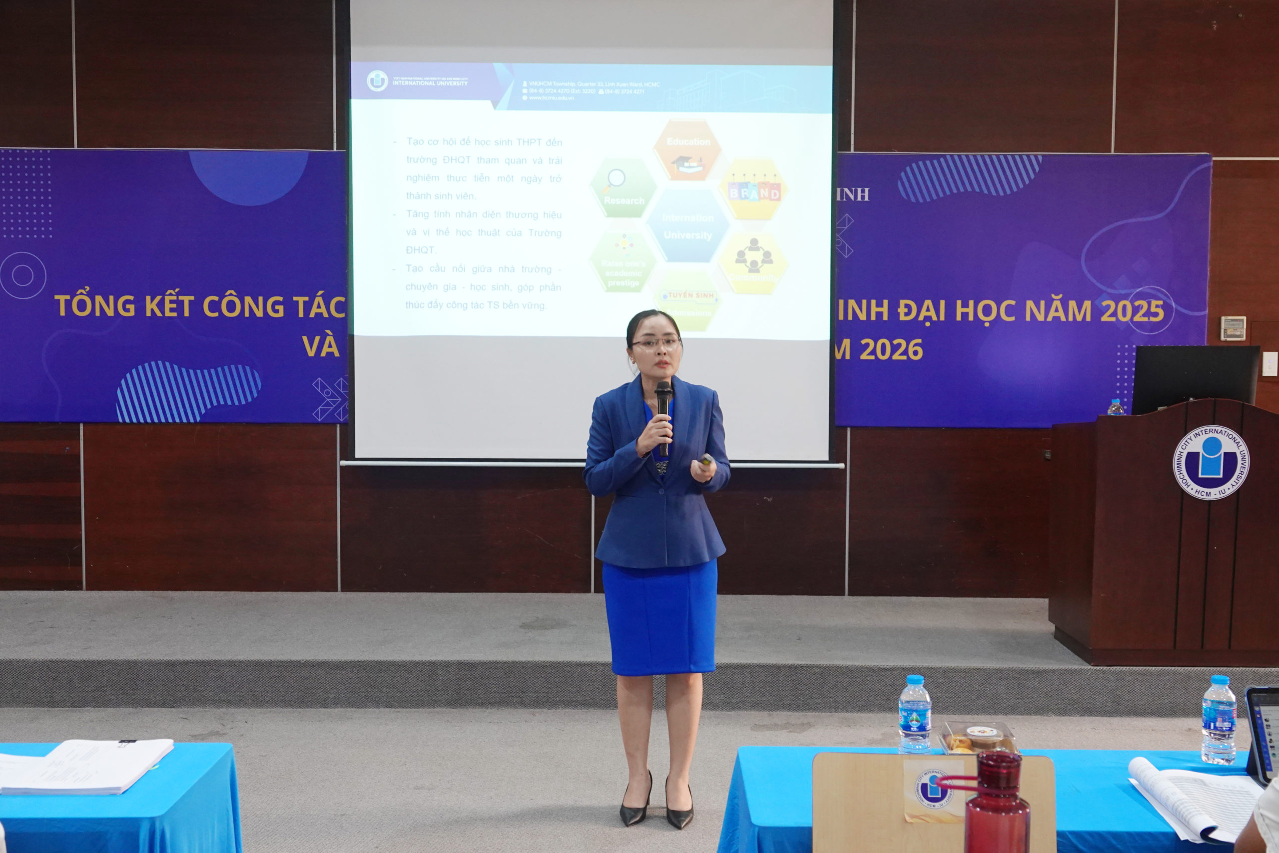 Kết quả mà toàn thể nhà trường đạt được trong một năm qua với nhiều dấu mốc quan trọng. Trường tổ chức được 20 chương trình trải nghiệm với hơn 3000 học sinh tham dự (như IU Summer Camp, các chương trình Public Talk…) và đây cũng là những chương trình luôn để lại cho những em học sinh đến thăm trường ĐHQT có nhiều ấn sâu sắc về đời sống sinh viên và chương trình giảng dạy, giúp các bạn học sinh lựa chọn trở thành những tân sinh viên của trường ĐHQT. Báo cáo cũng nhấn mạnh sự thành công của nhà trường trong sự năng động hướng nghiệp – tư vấn xét tuyển đại học năm 2025 với gần 400 chương trình tư vấn hướng nghiệp, tuyển sinh của nhà trường và gần 200 chương trình tư vấn tuyển sinh trực tuyến. Kết quả mà nhà trường đạt được trong năm nay thể hiện được tinh thần đoàn kết của toàn thể viên chức, nhân viên nhà trường trong công tác hướng nghiệp, tư vấn tuyển sinh”, ThS. Nguyễn Thị Việt Tú chia sẻ.